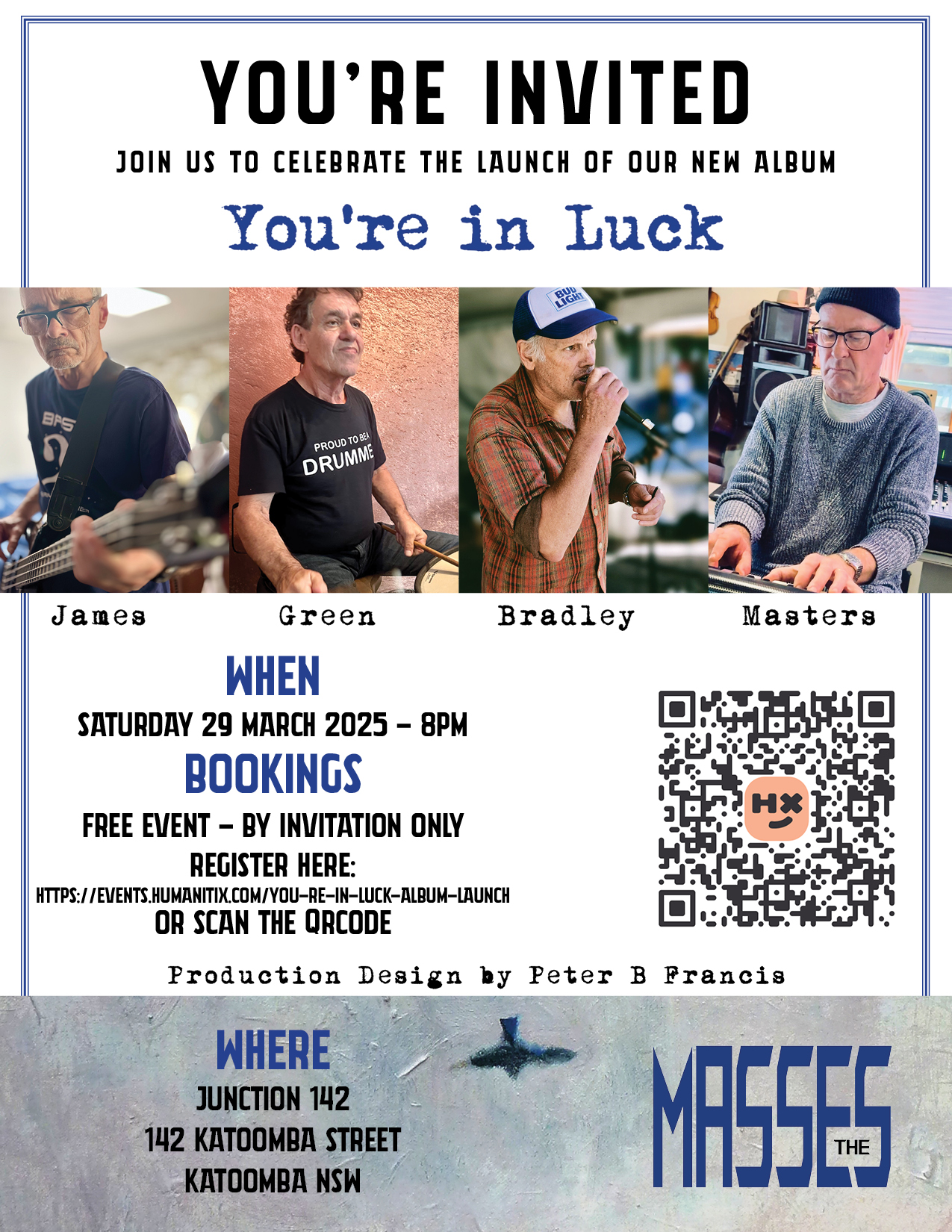With the album completed, Bradley set about creating a band to perform the album at its launch. For this he engaged Howard James, his friend and bass player from their band Redundant Technology, and drummer, Malcom Green. Rehearsals began in late 2024 at Green’s Leura, NSW studio, with Masters rehearsing remotely in New Zealand. Bradley once more engaged Peter B Francis to do production design for the launch, which took place at Junction 142, Katoomba on Saturday 29 March, 2025.